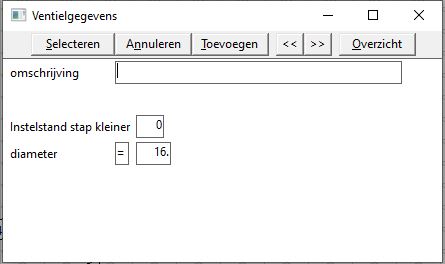 Wanneer het juiste ventiel is geselecteerd in de lijst en de daarbij behorende leiding actief is, dan verschijnt in het schermpje links onder een veld voor Ruimte Nr en Instelgegevens, zoals in de volgende afbeelding te zien is.