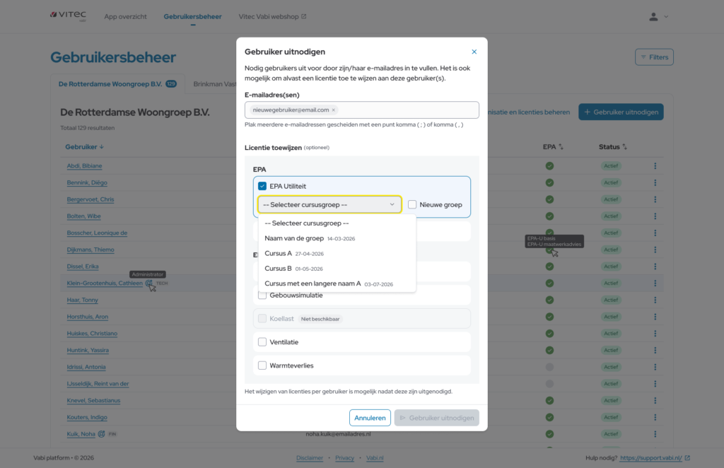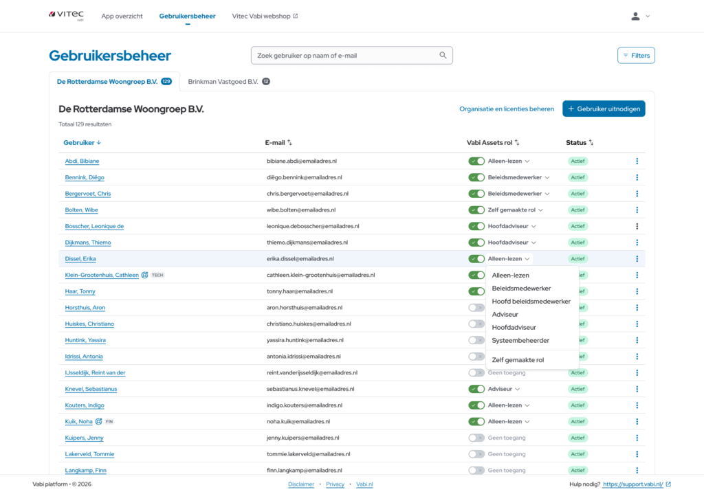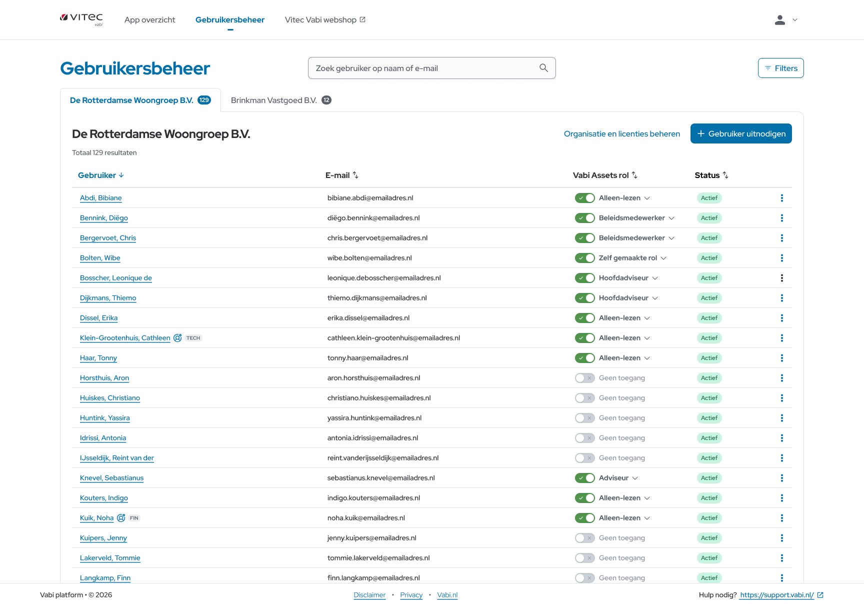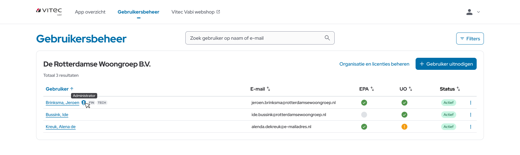 Als administrator kun je in het Vabi-platform gebruikers beheren die toegang hebben tot de Vabi-software. Hieronder staan de belangrijkste functies uitgelegd.