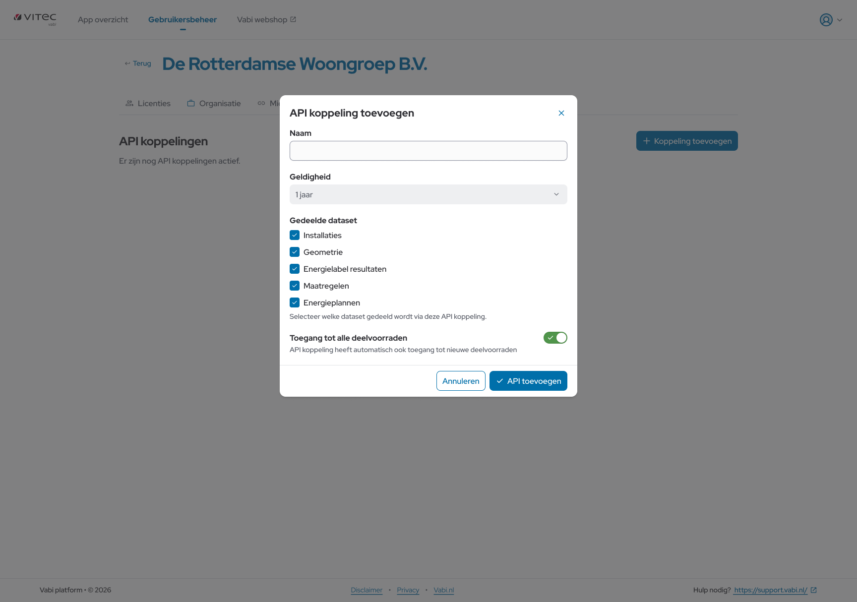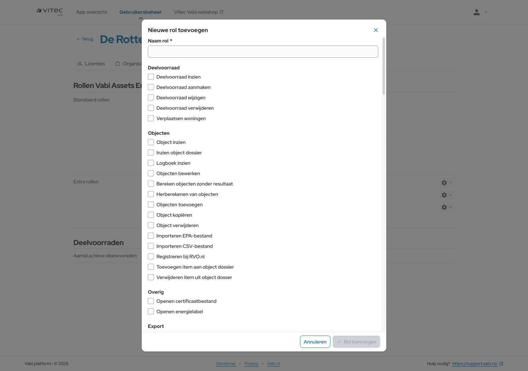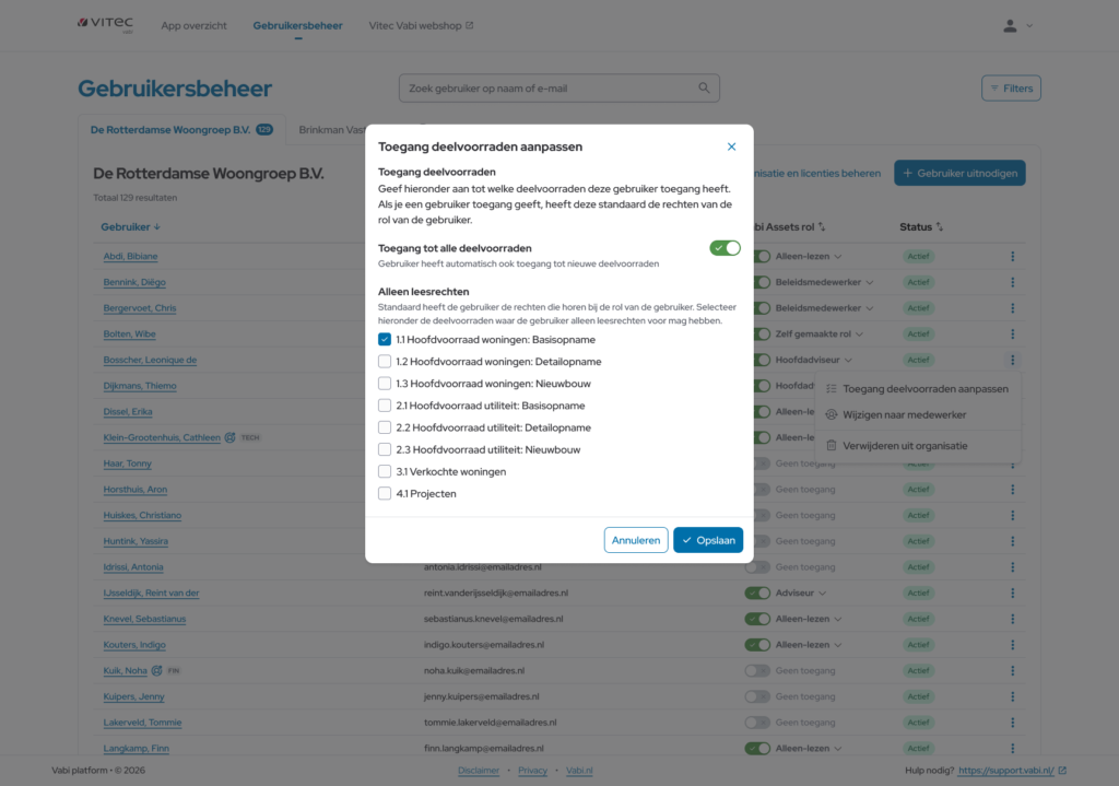 Als administrator kun je in het Vabi-platform gebruikers beheren die toegang hebben tot de Vabi-software. Hieronder staan de belangrijkste functies uitgelegd.