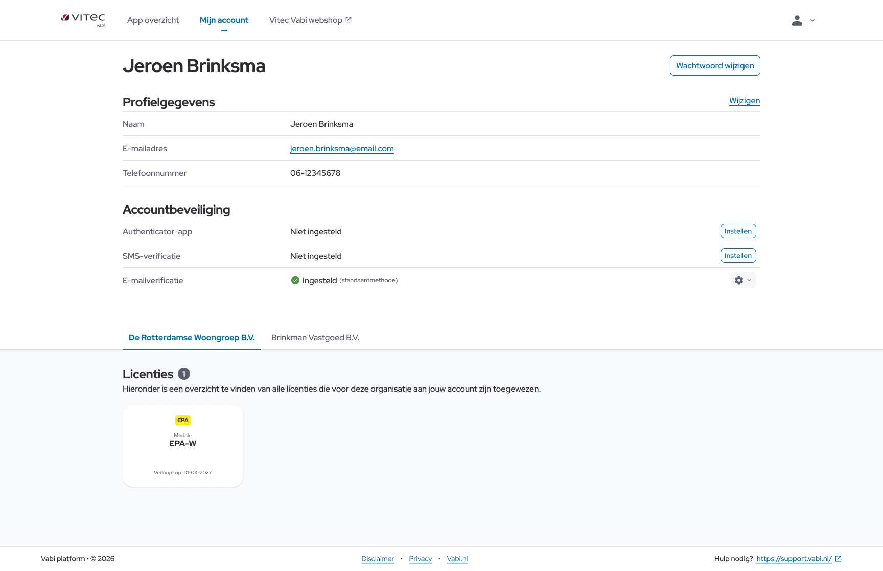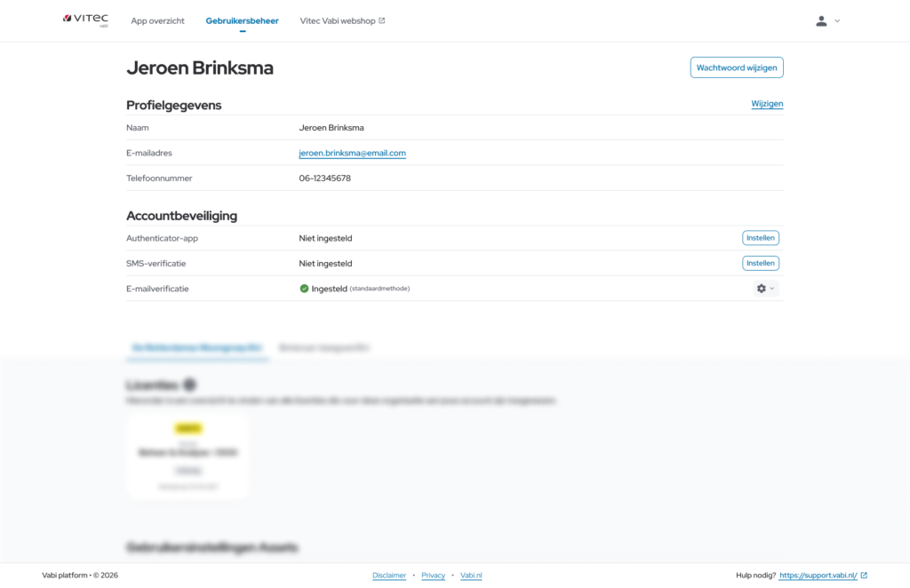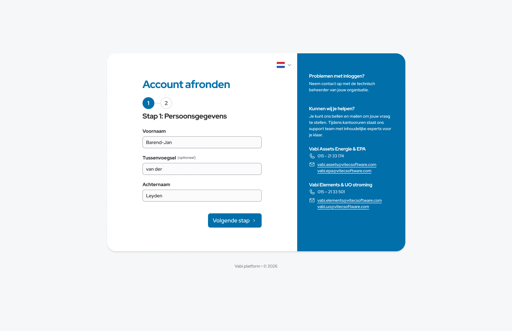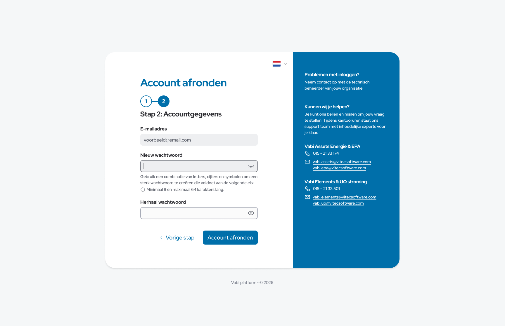 Is jouw account aangemaakt door Vabi tijdens de overgangsperiode van het vorige klantportaal naar het nieuwe klantportaal? Dan bestaat het afronden van je account uit drie stappen. Het is tijdens dit proces mogelijk om direct een licentie aan je eigen account toe te wijzen.