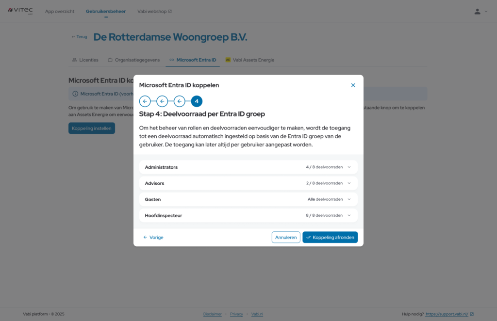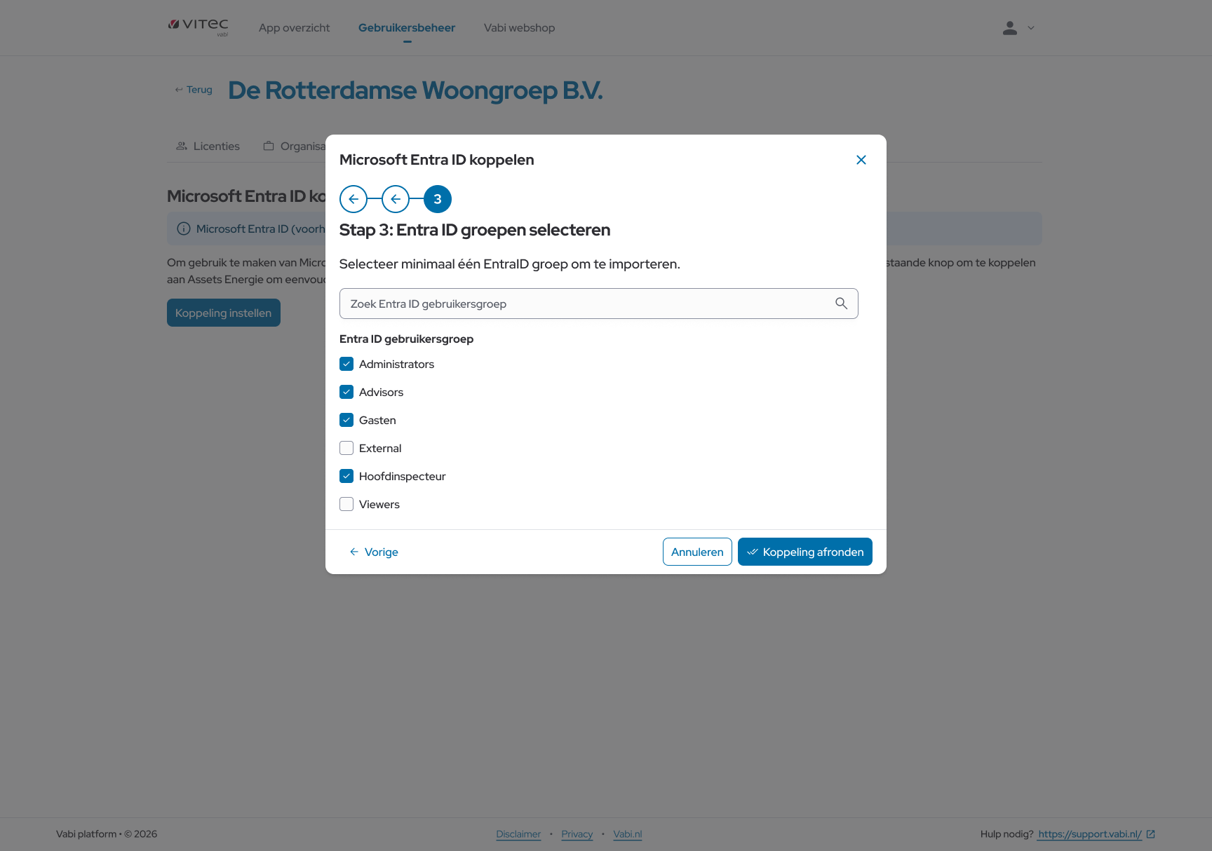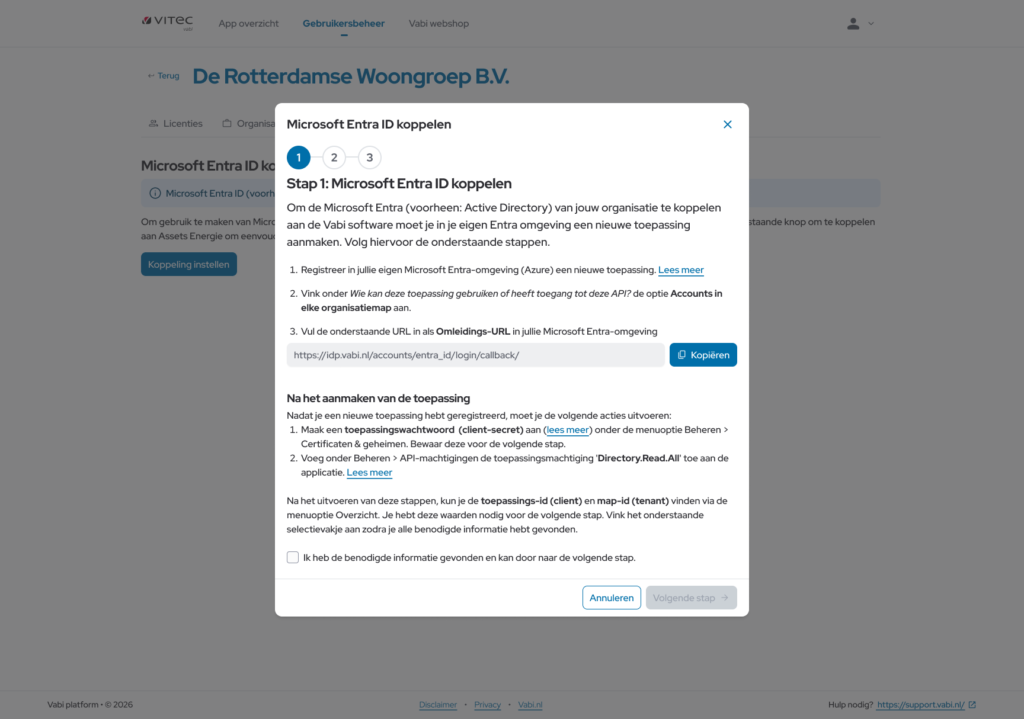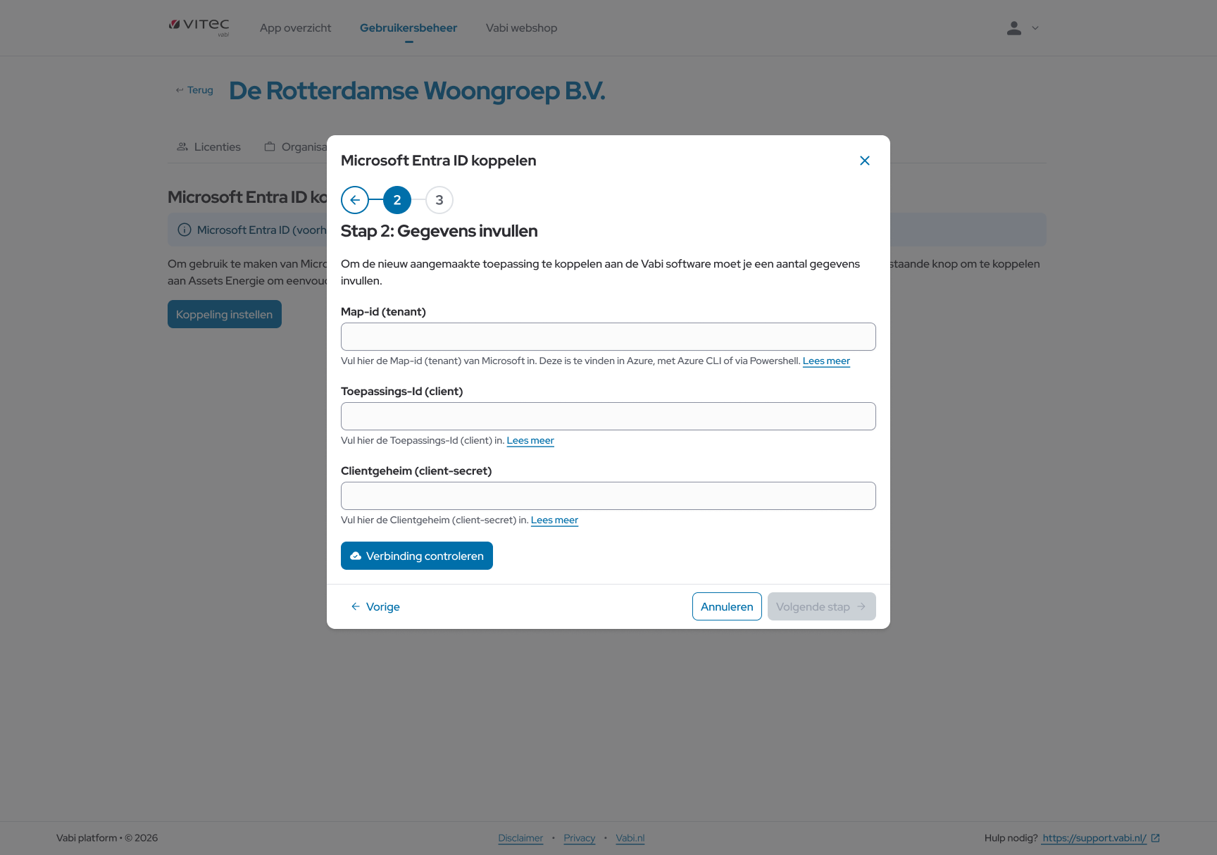 Is jouw account aangemaakt door Vabi tijdens de overgangsperiode van het vorige klantportaal naar het nieuwe klantportaal? Dan bestaat het afronden van je account uit drie stappen. Het is tijdens dit proces mogelijk om direct een licentie aan je eigen account toe te wijzen.