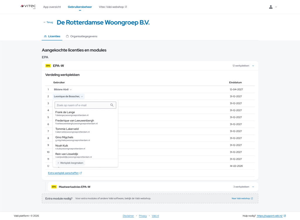 - Selecteer de licentie (bijvoorbeeld EPA Woningen) om een overzicht van beschikbare werkplekken te zien.